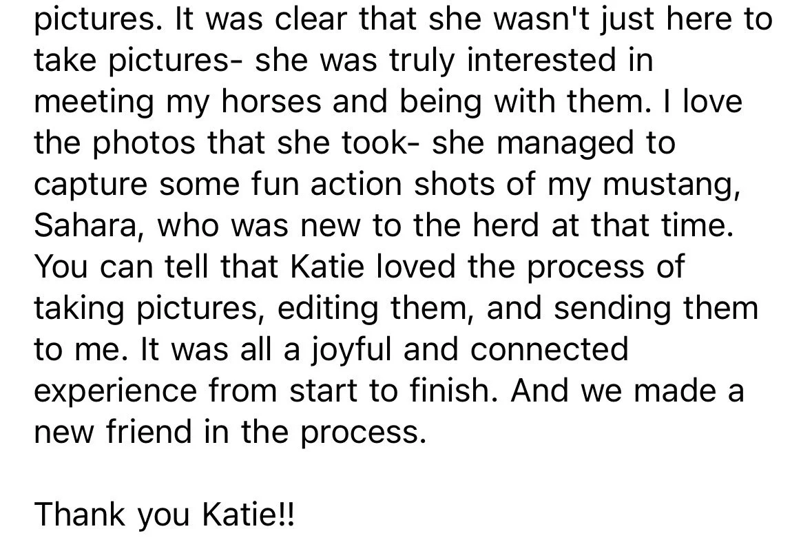 I’m not just a photographer — I’m a horse girl too. I know when to give your horse a break, how to read their energy, and how to get that just right shot without stress or force. You won’t be rushed, and your horse will be respected every step of the way.